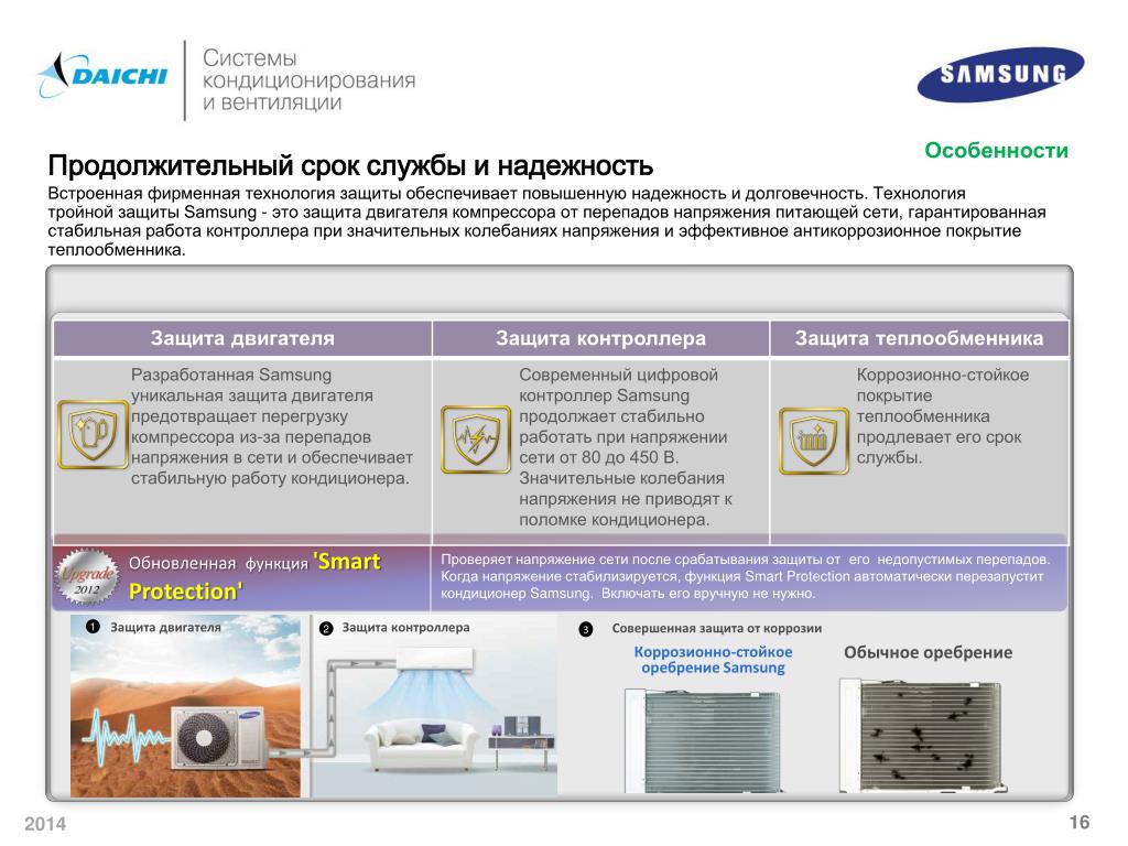 Коррозионно-стойкоеоребрение Samsung Обычное оребрение Особенности Продолжительный срок службы и надежность Встроенная фирменная технология защиты обеспечивает повышенную надежность и долговечность. Технология тройной защиты Samsung - это защита двигателя компрессора от перепадов напряжения питающей сети, гарантированная стабильная работа контроллера при значительных колебаниях напряжения и эффективное антикоррозионное покрытие теплообменника. Обновленная функция'Smart Protection' Проверяет напряжение сети после срабатывания защиты от его недопустимых перепадов. Когда напряжение стабилизируется, функция Smart Protection автоматически перезапустит кондиционер Samsung. Включать его вручную не нужно. Защита двигателя Защита контроллера 1 Совершенная защита от коррозии 2 3