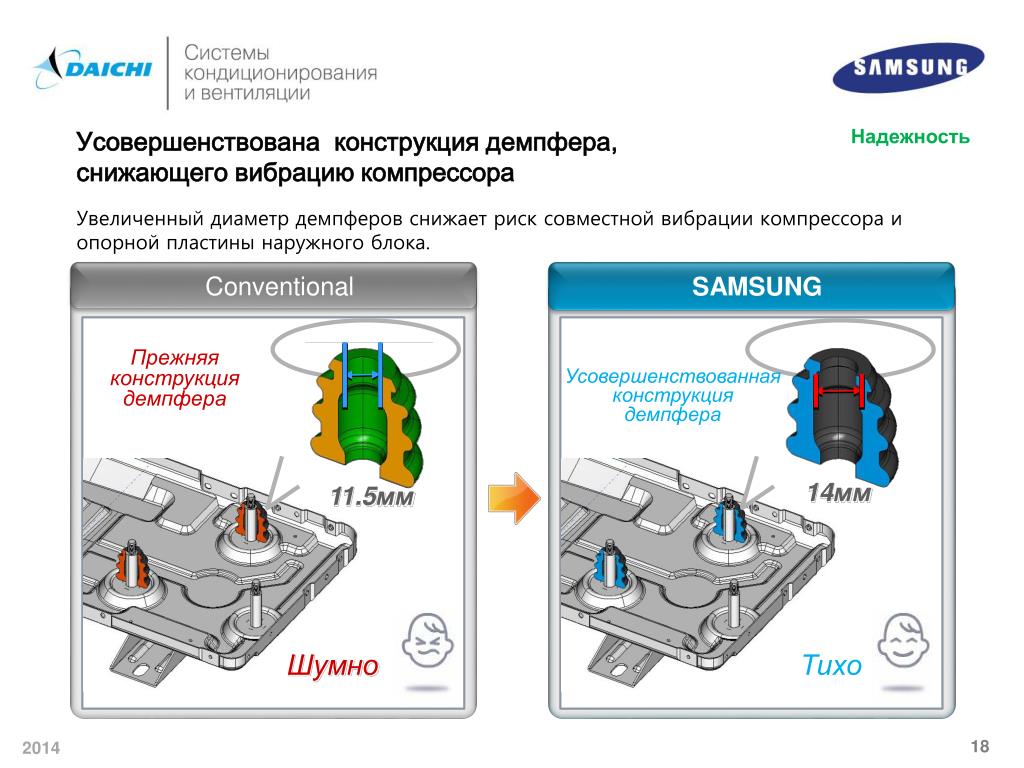 Надежность Усовершенствована конструкция демпфера,снижающего вибрацию компрессора Увеличенный диаметр демпферов снижает риск совместной вибрации компрессора и опорной пластины наружного блока. Conventional SAMSUNG Прежняя конструкция демпфера Усовершенствованная конструкция демпфера 14мм 11.5мм Шумно Тихо