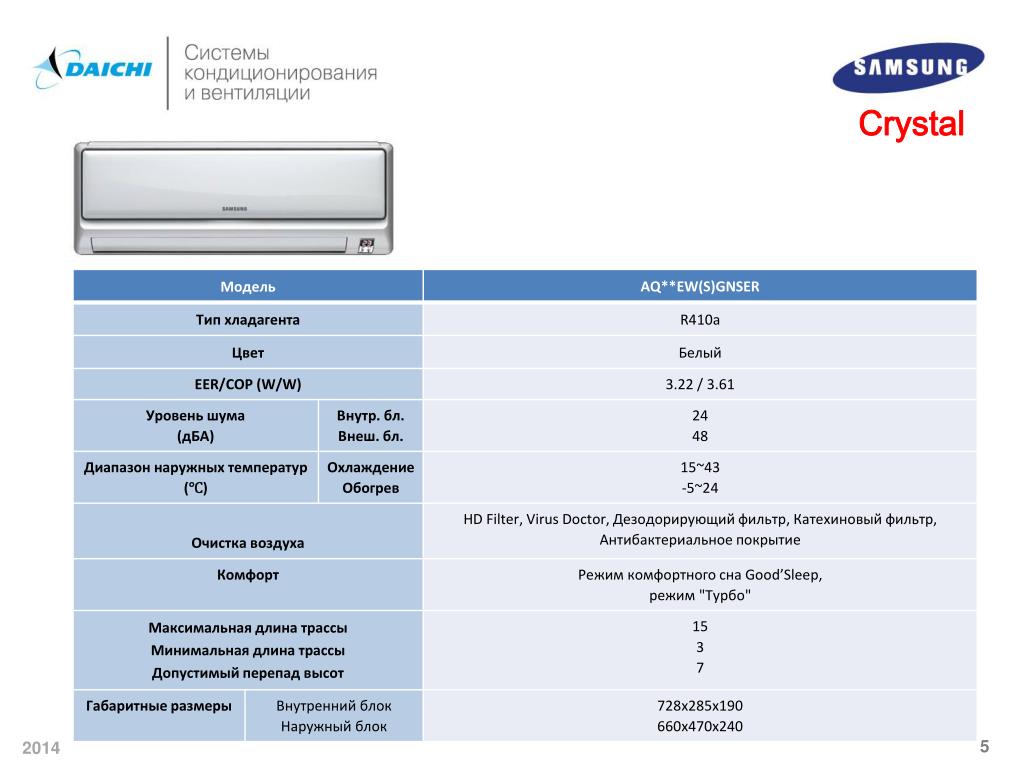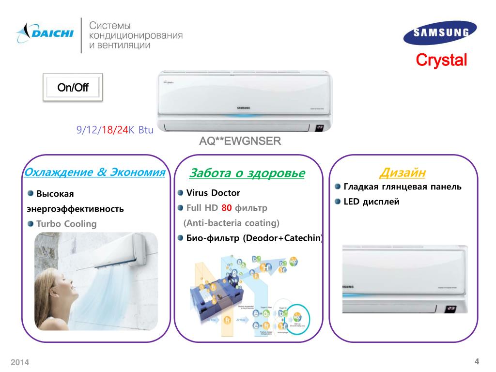 Линейка Daichi бытовых кондиционеров Samsung 201 4. Линейка Daichi бытовых кондиционеров Samsung 2012. Модельный ряд Crystal. Номенклатура бытовых кондиционеров . Crystal. On/Off. 9/12/ 18/24 K Btu. AQ**EW G NSER. Охлаждение & Экономия. Забота о здоровье. Дизайн.