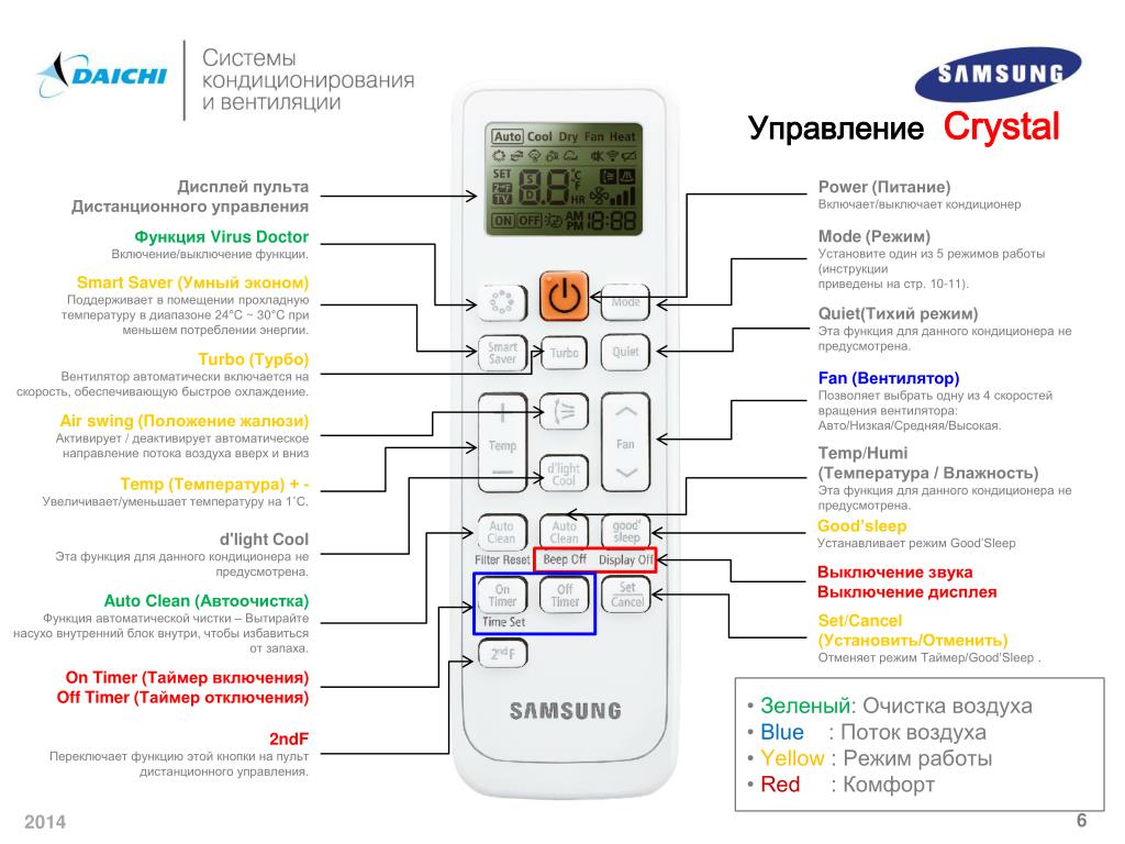 Управление Crystal Дисплей пульта Дистанционного управления Power(Питание) Включает/выключает кондиционер Mode (Режим) Установите один из 5 режимов работы (инструкции приведены на стр. 10-11). Функция Virus Doctor Включение/выключение функции. SmartSaver (Умный эконом) Поддерживает в помещении прохладную температуру в диапазоне 24°C ~ 30°C при меньшем потреблении энергии. Quiet(Тихий режим) Эта функция для данного кондиционера не предусмотрена. Turbo (Турбо) Вентилятор автоматическивключаетсяна скорость, обеспечивающуюбыстроеохлаждение. Fan (Вентилятор) Позволяет выбрать одну из 4 скоростей вращения вентилятора: Авто/Низкая/Средняя/Высокая. Airswing (Положение жалюзи) Активирует / деактивирует автоматическое направление потока воздуха вверх и вниз Temp/Humi (Температура / Влажность) Эта функция для данного кондиционера не предусмотрена. Temp(Температура) + - Увеличивает/уменьшает температуру на 1˚C. Good’sleep Устанавливает режим Good’Sleep d'light Cool Эта функция для данного кондиционера не предусмотрена. Выключение звука Выключение дисплея AutoClean (Автоочистка) Функция автоматической чистки – Вытирайте насухо внутренний блок внутри, чтобы избавиться от запаха. Set/Cancel (Установить/Отменить) Отменяет режим Таймер/Good’Sleep. On Timer(Таймер включения) Off Timer(Таймер отключения) • Зеленый: Очистка воздуха • Blue : Поток воздуха • Yellow : Режим работы • Red : Комфорт 2ndF Переключает функцию этой кнопки на пульт дистанционного управления.