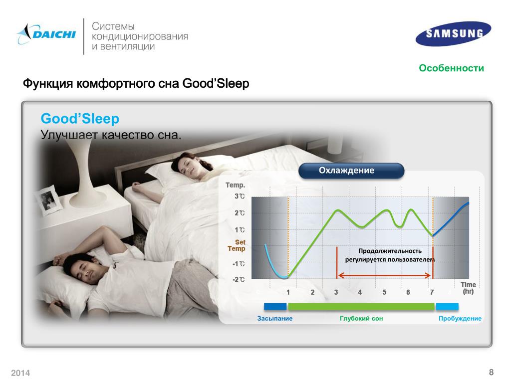 Охлаждение Особенности Функция комфортного сна Good’Sleep Good’Sleep Улучшает качество сна. Продолжительность регулируется пользователем 0 8 Засыпание Глубокий сон Пробуждение