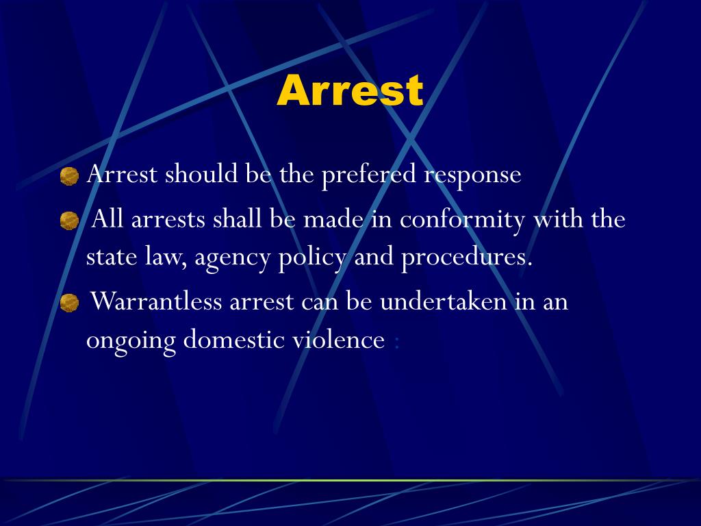 Arrest • Arrest should be the prefered response • All arrests shall be made in conformity with the state law, agency policy and procedures. • Warrantless arrest can be undertaken in an ongoing domestic violence :