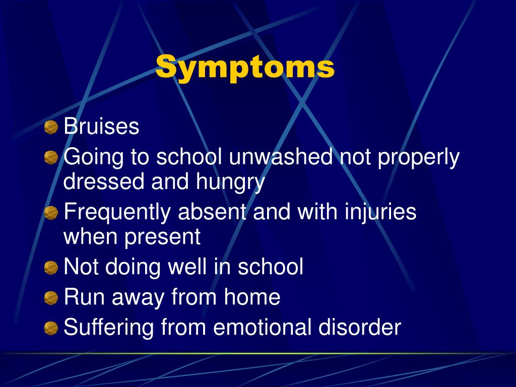 Symptoms • Bruises • Going to school unwashed not properly dressed and hungry • Frequently absent and with injuries when present • Not doing well in school • Run away from home • Suffering from emotional disorder