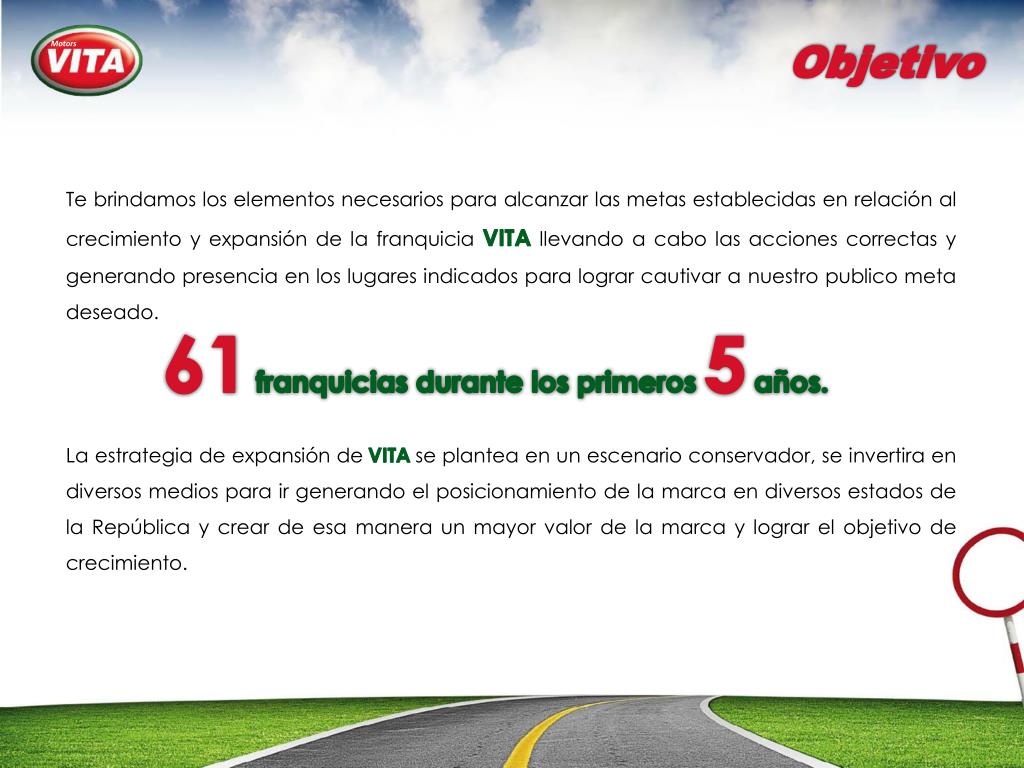 Objetivo Motors Te brindamos los elementos necesarios para alcanzar las metas establecidas en relación al crecimiento y expansión de la franquicia VITAllevando a cabo las acciones correctas y generando presencia en los lugares indicados para lograr cautivar a nuestro publico meta deseado. La estrategia de expansión deVITAse plantea en un escenario conservador, se invertira en diversos medios para ir generando el posicionamiento de la marca en diversos estados de la República y crear de esa manera un mayor valor de la marca y lograr el objetivo de crecimiento. 61franquicias durante los primeros 5años.