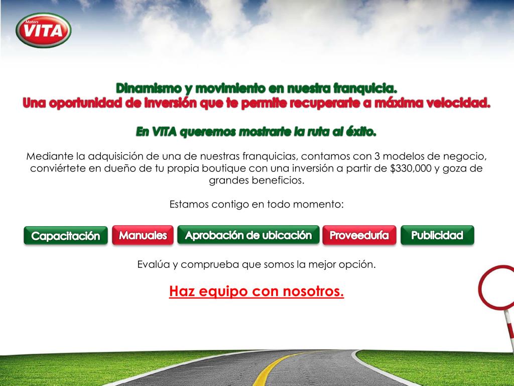 Motors Dinamismo y movimiento en nuestra franquicia. Una oportunidad de inversión que te permite recuperarte a máxima velocidad. En VITA queremos mostrarte la ruta al éxito. Mediante la adquisición de una de nuestras franquicias, contamos con 3 modelos de negocio, conviértete en dueño de tu propia boutique con una inversión a partir de $330,000 y goza de grandes beneficios. Estamos contigo en todo momento: Evalúa y comprueba que somos la mejor opción. Haz equipo con nosotros. Aprobación de ubicación Proveeduría Publicidad Manuales Capacitación