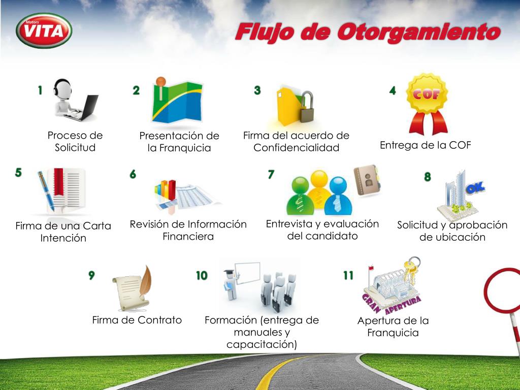 Flujo de Otorgamiento Motors Revisión de Información Financiera Firma del acuerdo de Confidencialidad Firma de Contrato 1 2 3 4 Presentación de la Franquicia 5 6 7 Proceso de Solicitud Entrega de la COF Firma de una Carta Intención Entrevista y evaluación del candidato 8 9 10 11 Formación (entrega de manuales y capacitación) Solicitud y aprobación de ubicación Apertura de la Franquicia