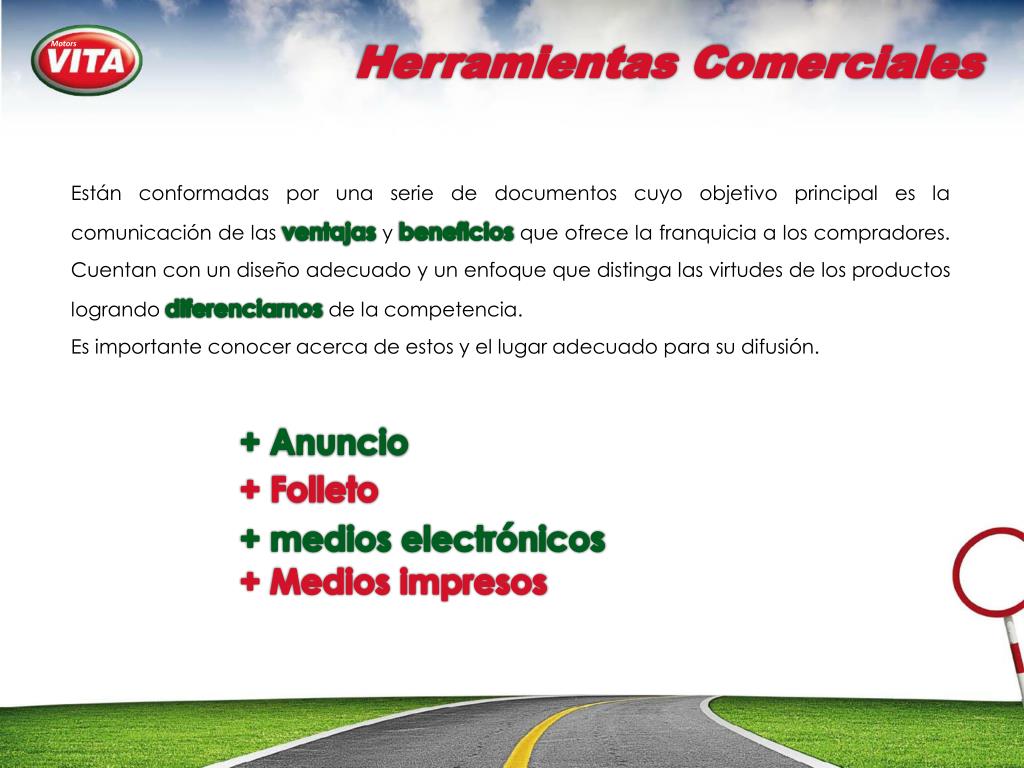 Herramientas Comerciales Motors Están conformadas por una serie de documentos cuyo objetivo principal es la comunicación de las ventajas y beneficios que ofrece la franquicia a los compradores. Cuentan con un diseño adecuado y un enfoque que distinga las virtudes de los productos logrando diferenciarnosde la competencia. Es importante conocer acerca de estos y el lugar adecuado para su difusión. + Anuncio + Folleto + medios electrónicos + Medios impresos