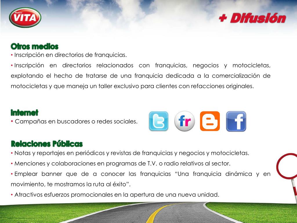 + Difusión Motors Otros medios • Inscripción en directorios de franquicias. • Inscripción en directorios relacionados con franquicias, negocios y motocicletas, explotando el hecho de tratarse de una franquicia dedicada a la comercialización de motocicletas y que maneja un taller exclusivo para clientes con refacciones originales. • Campañas en buscadores o redes sociales. • Notas y reportajes en periódicos y revistas de franquicias y negocios y motocicletas. • Menciones y colaboraciones en programas de T.V. o radio relativos al sector. • Emplear banner que de a conocer las franquicias “Una franquicia dinámica y en movimiento, te mostramos la ruta al éxito”. • Atractivos esfuerzos promocionales en la apertura de una nueva unidad. internet Relaciones Públicas