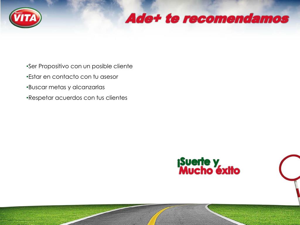 Ade+ te recomendamos Motors • Ser Propositivo con un posible cliente • Estar en contacto con tu asesor • Buscar metas y alcanzarlas • Respetar acuerdos con tus clientes ¡Suerte y Mucho éxIto