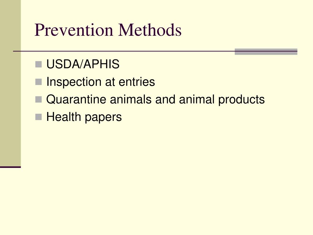 Prevention Methods • USDA/APHIS • Inspection at entries • Quarantine animals and animal products • Health papers