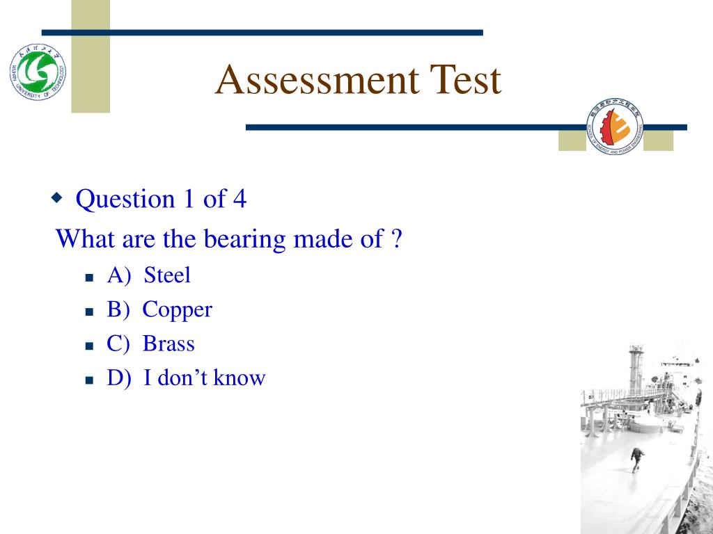 Assessment Test • Question 1 of 4 What are the bearing made of ? • A) Steel • B) Copper • C) Brass • D) I don’t know