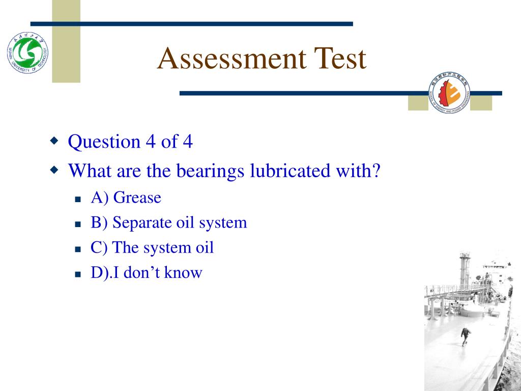 Assessment Test • Question 4 of 4 • What are the bearings lubricated with? • A) Grease • B) Separate oil system • C) The system oil • D).I don’t know