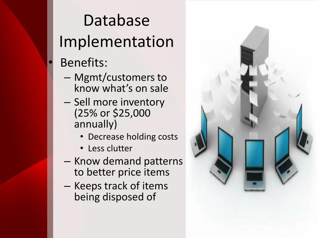 Database Implementation • Benefits: • Mgmt/customers to know what’s on sale • Sell more inventory (25% or $25,000 annually) • Decrease holding costs • Less clutter • Know demand patterns to better price items • Keeps track of items being disposed of