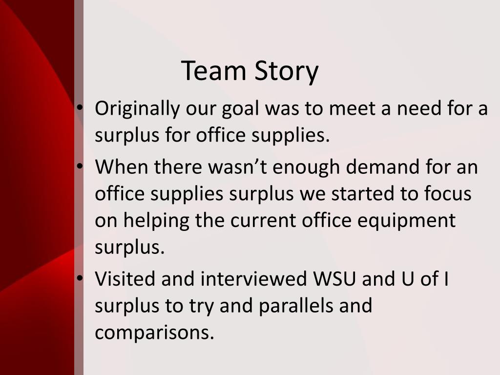Team Story • Originally our goal was to meet a need for a surplus for office supplies. • When there wasn’t enough demand for an office supplies surplus we started to focus on helping the current office equipment surplus. • Visited and interviewed WSU and U of I surplus to try and parallels and comparisons.