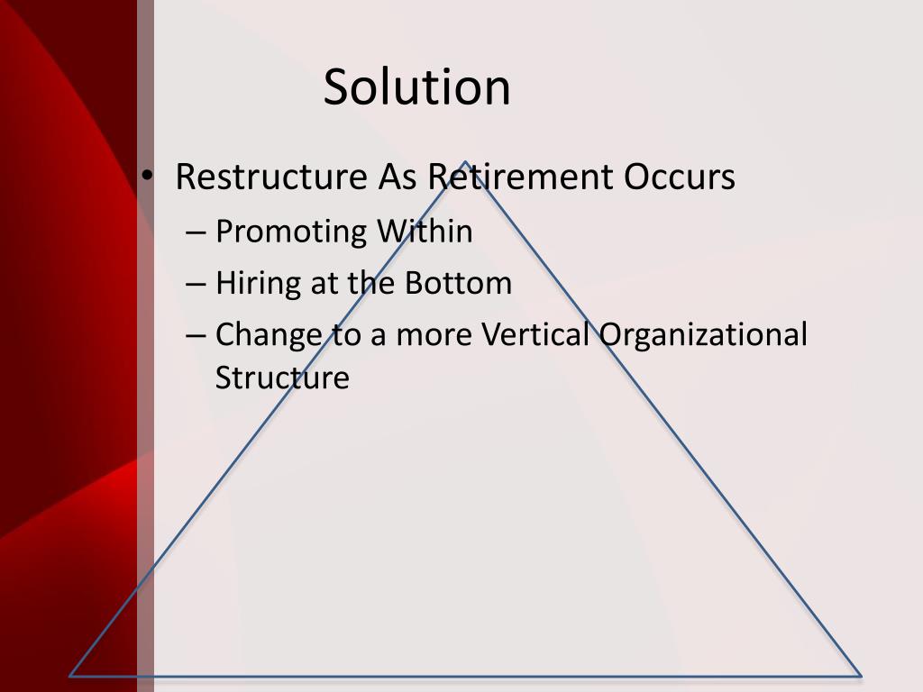 Solution • Restructure As Retirement Occurs • Promoting Within • Hiring at the Bottom • Change to a more Vertical Organizational Structure