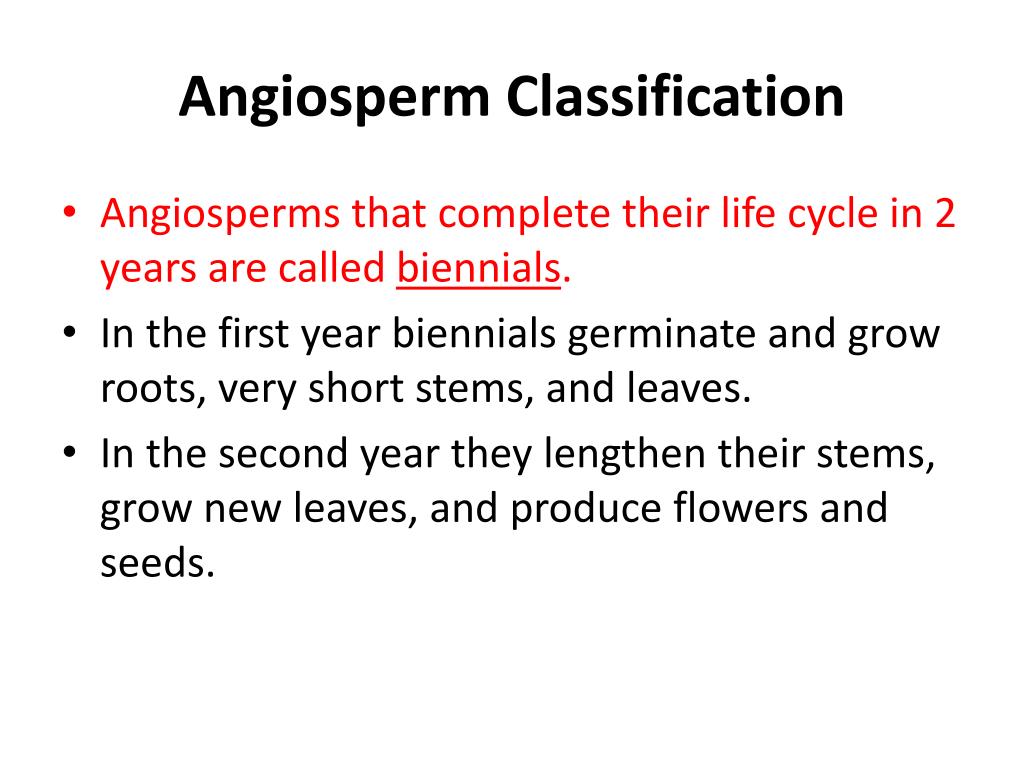 Angiosperm Classification • Angiosperms that complete their life cycle in 2 years are called biennials. • In the first year biennials germinate and grow roots, very short stems, and leaves. • In the second year they lengthen their stems, grow new leaves, and produce flowers and seeds.