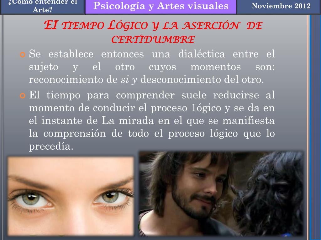 EI tiempo Lógico y la aserción de certidumbre • Se establece entonces una dialéctica entre el sujeto y el otro cuyos momentos son: reconocimiento de si y desconocimiento del otro. • El tiempo para comprender suele reducirse al momento de conducir el proceso 1ógico y se da en el instante de La mirada en el que se manifiesta la comprensión de todo el proceso lógico que lo precedía.