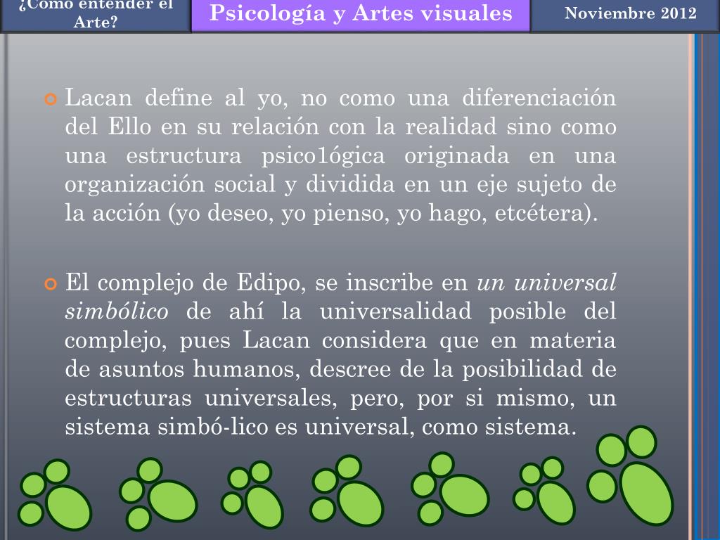 Lacan define al yo, no como una diferenciación del Ello en su relación con la realidad sino como una estructura psico1ógica originada en una organización social y dividida en un eje sujeto de la acción (yo deseo, yo pienso, yo hago, etcétera). • El complejo de Edipo, se inscribe en un universal simbólico de ahí la universalidad posible del complejo, pues Lacan considera que en materia de asuntos humanos, descree de la posibilidad de estructuras universales, pero, por si mismo, un sistema simbó-lico es universal, como sistema.