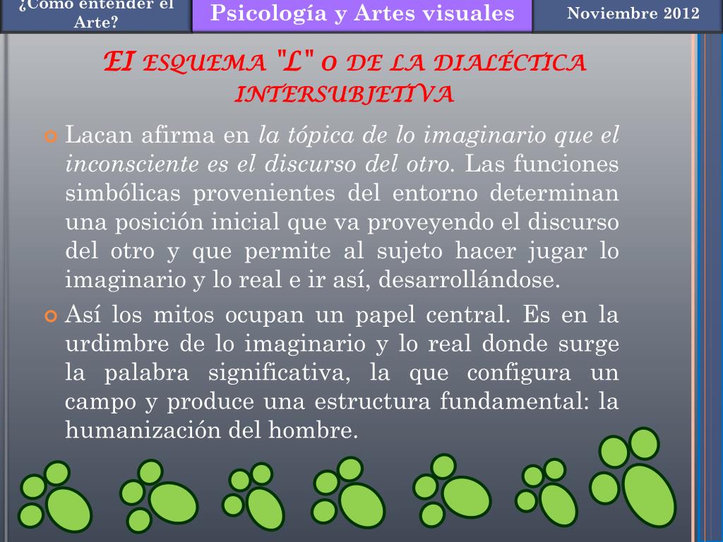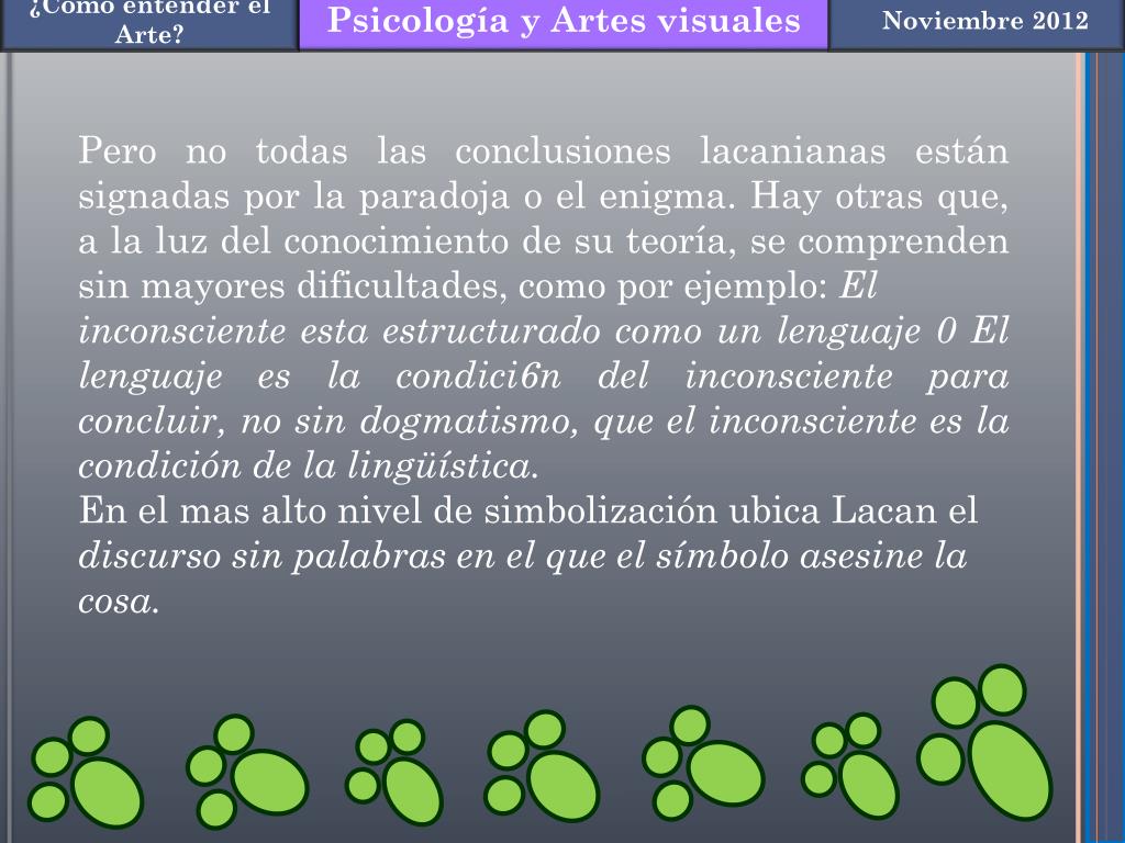 La significación se deduce de la relaci6n entre significante y significado, idea también presente en varios momentos de las propuestas estéticas vanguardistas. Así como en el arte, las formas producen la significaci6n, en el inconsciente, la incorporación de las palabras-símbolos las letras, al decir de Lacan, producen el significada de una vida, siempre para un sujeto que no es propio sujeto porque el es un significante para otro y es también el resultado del Otro.