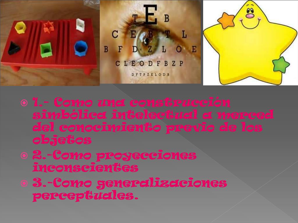 1.- Como una construcción simbólica intelectual a merced del conocimiento previo de los objetos • 2.-Como proyecciones inconscientes • 3.-Como generalizaciones perceptuales.