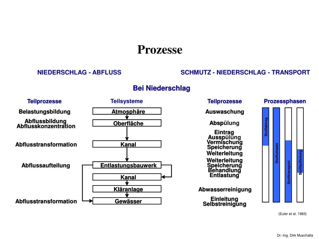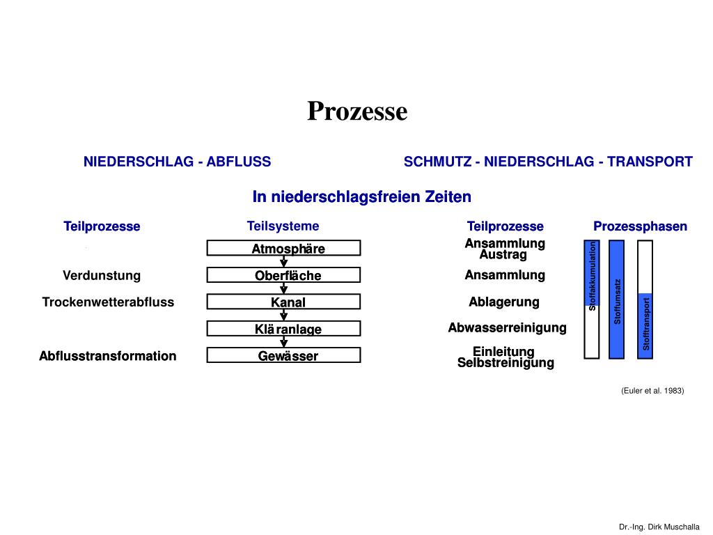 NIEDERSCHLAG - ABFLUSS SCHMUTZ - NIEDERSCHLAG - TRANSPORT Prozesse In niederschlagsfreien Zeiten In niederschlagsfreien Zeiten Teilsysteme Teilprozesse Teilprozesse Teilprozesse Teilprozesse Prozessphasen Prozessphasen Ansammlung Ansammlung Atmosph Atmosph ä ä re re Austrag Austrag Ansammlung Ansammlung Verdunstung Oberfl Oberfl ä ä che che Stoffakkumulation Stoffakkumulation Ablagerung Ablagerung Trockenwetterabfluss Kanal Kanal Stoffumsatz Stoffumsatz Abwasserreinigung Abwasserreinigung Stofftransport Stofftransport Kl Kl ä ä ranlage ranlage Einleitung Einleitung Abflusstransformation Abflusstransformation Gew Gew ä ä sser sser Selbstreinigung Selbstreinigung (Euler et al. 1983)
