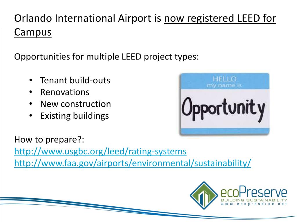 Orlando International Airport is now registered LEED for Campus • Opportunitiesfor multiple LEED project types: • Tenant build-outs • Renovations • New construction • Existing buildings • How to prepare?: • http://www.usgbc.org/leed/rating-systems • http://www.faa.gov/airports/environmental/sustainability/