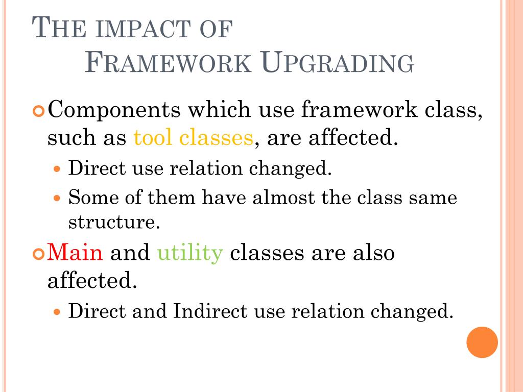The impact of Framework Upgrading • Components which use framework class, such as tool classes, are affected. • Direct use relation changed. • Some of them have almost the class same structure. • Main and utility classes are also affected. • Direct and Indirect use relation changed.