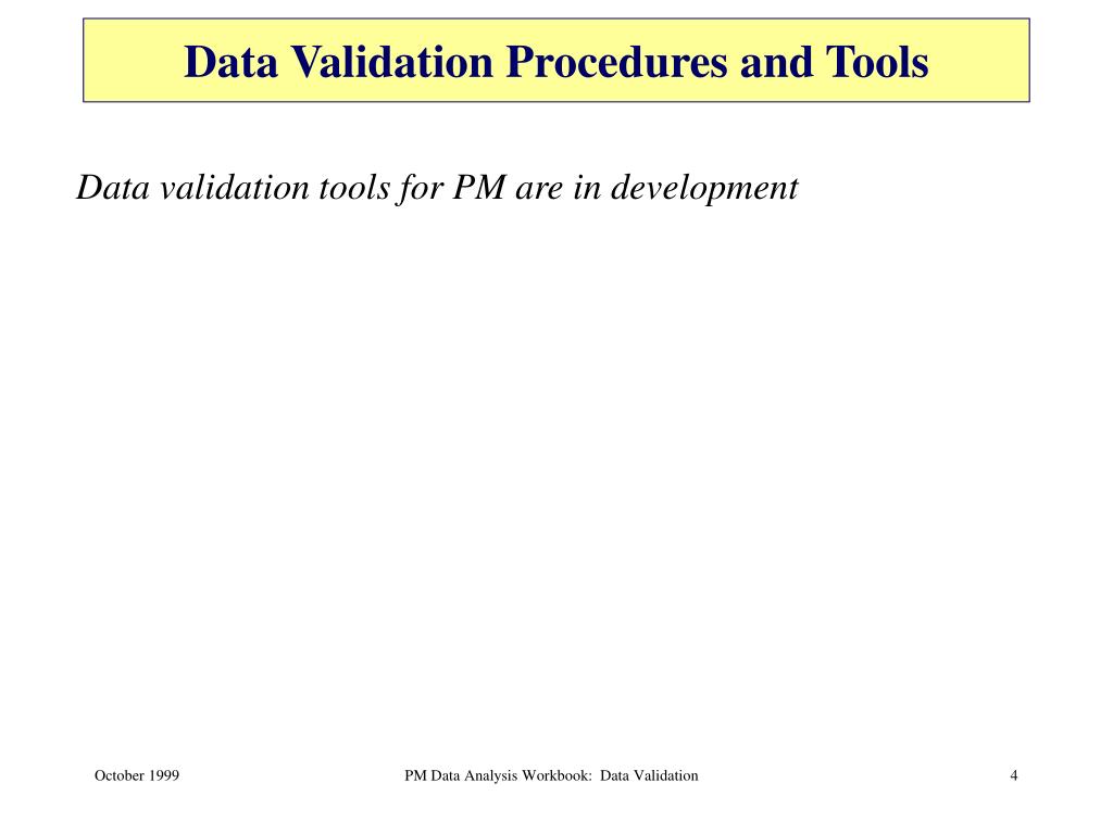 Data Validation Procedures and Tools Data validation tools for PM are in development PM Data Analysis Workbook: Data Validation