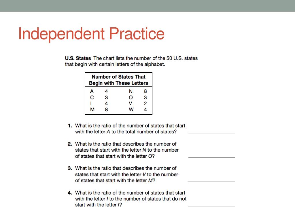 Example 1 • The coed soccer team has four time as many boys as it has girls. We say the ratio of the number of the boys to the girls in the team in 4:1. We read this as four to one. • What are some other options that show four times as many as boys as girls or a ratio of boys to girls of 4 to 1? • What are some other option to show that there are three boys for every two girls on the team?
