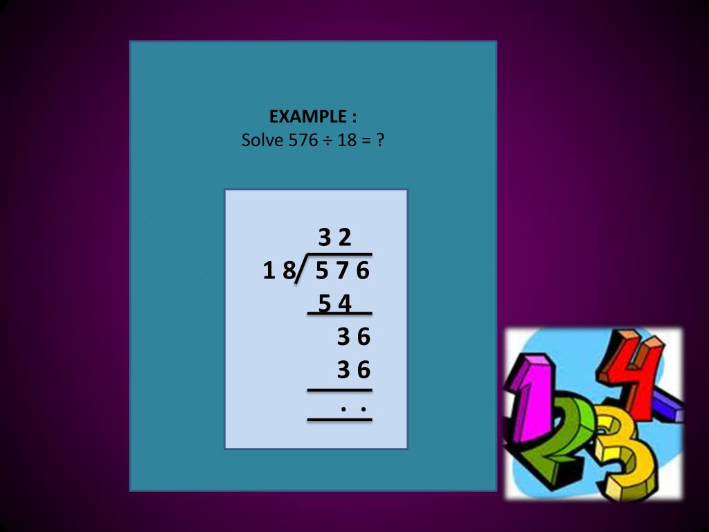 EXAMPLE : Solve 576 ÷ 18 = ? 3 2 1 8 5 7 6 5 4 3 6 3 6 . .