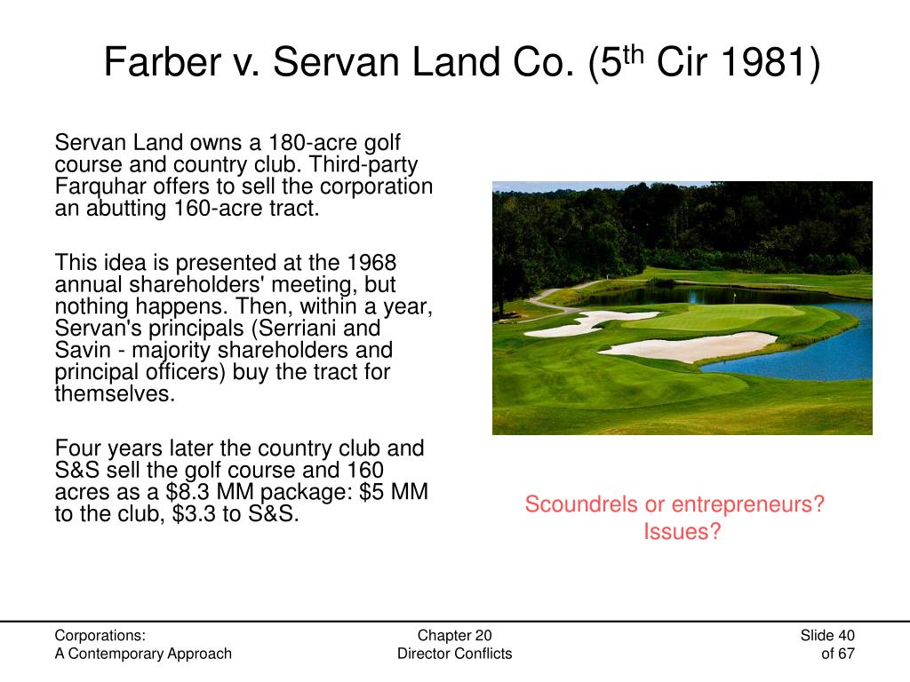 Farber v. Servan Land Co. (5th Cir 1981) Servan Land owns a 180-acre golf course and country club. Third-party Farquhar offers to sell the corporation an abutting 160-acre tract. This idea is presented at the 1968 annual shareholders' meeting, but nothing happens. Then, within a year, Servan's principals (Serriani and Savin - majority shareholders and principal officers) buy the tract for themselves. Four years later the country club and S&S sell the golf course and 160 acres as a $8.3 MM package: $5 MM to the club, $3.3 to S&S. Scoundrels or entrepreneurs? Issues? Chapter 20 Director Conflicts