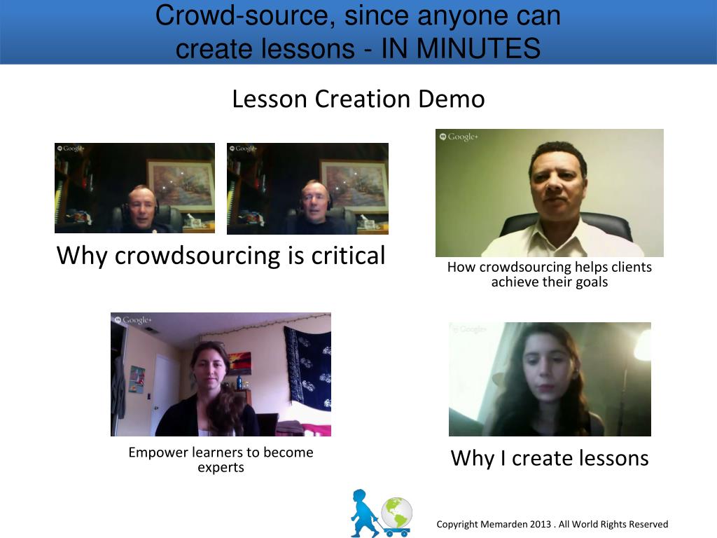 Crowd-source, since anyone can create lessons - IN MINUTES How crowdsourcing helps clients achieve their goals Empower learners to become experts Why I create lessons Lesson Creation Demo Why crowdsourcing is critical