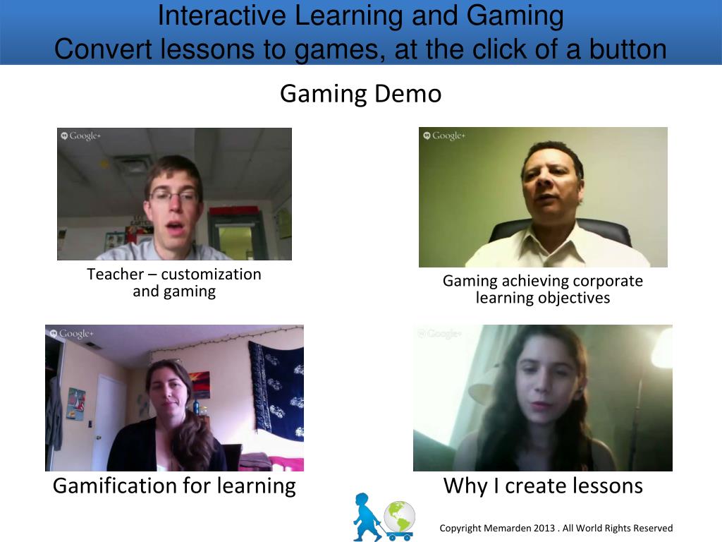 Interactive Learning and GamingConvert lessons to games, at the click of a button Gaming achieving corporate learning objectives Gamification for learning Why I create lessons Gaming Demo Teacher – customization and gaming