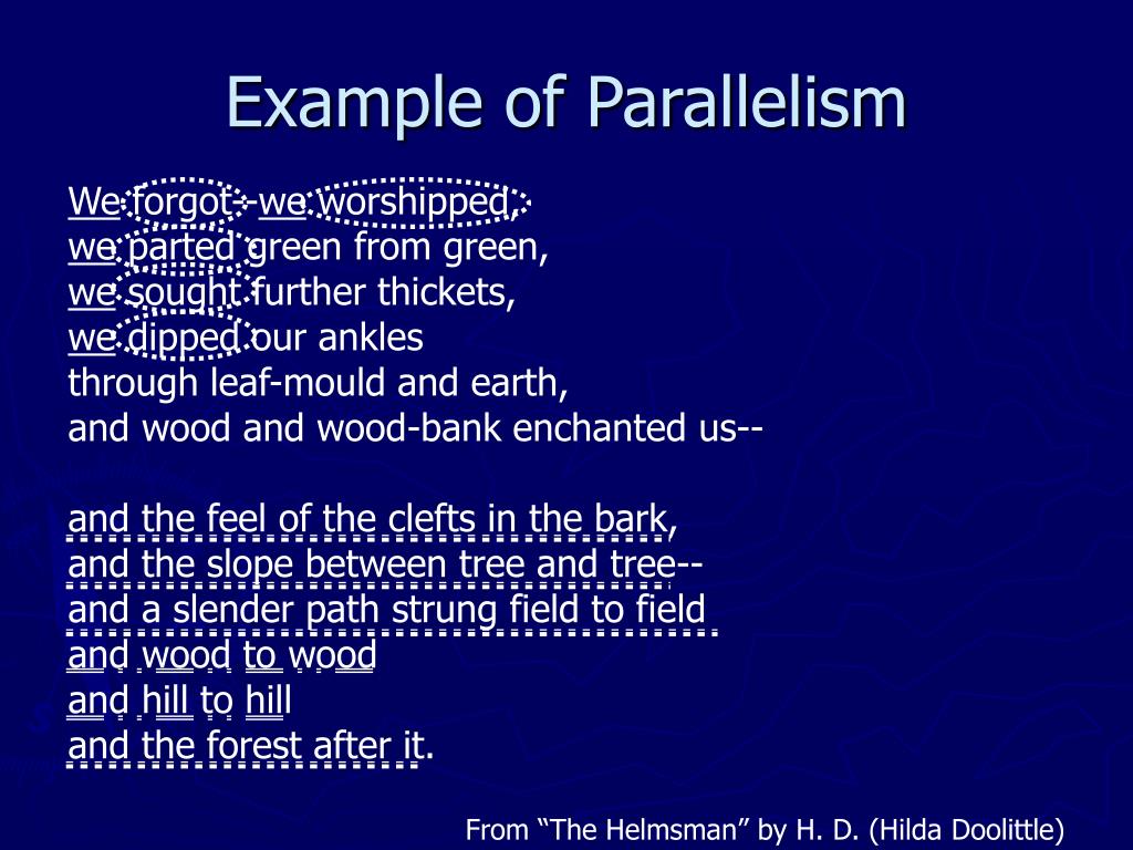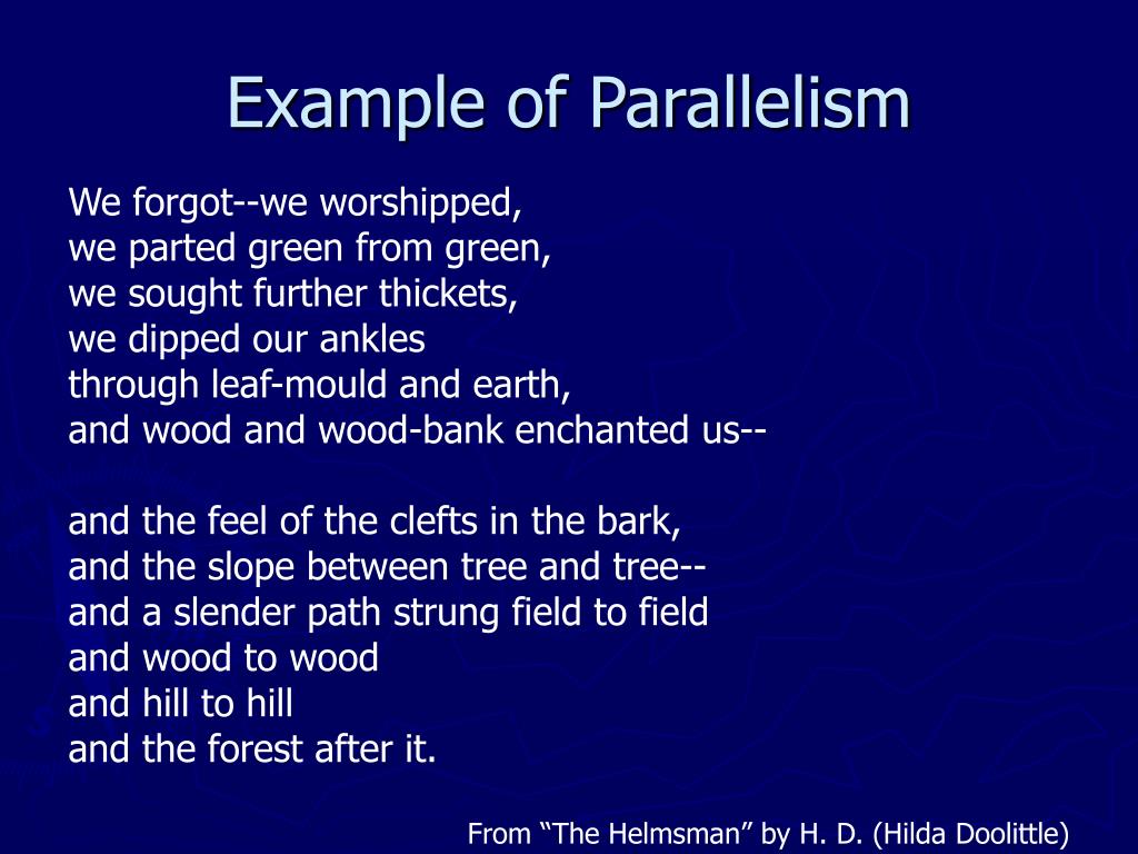 Example of Parallelism We forgot--we worshipped,we parted green from green,we sought further thickets,we dipped our anklesthrough leaf-mould and earth,and wood and wood-bank enchanted us--and the feel of the clefts in the bark,and the slope between tree and tree--and a slender path strung field to field and wood to woodand hill to hilland the forest after it. From “The Helmsman” by H. D. (Hilda Doolittle)