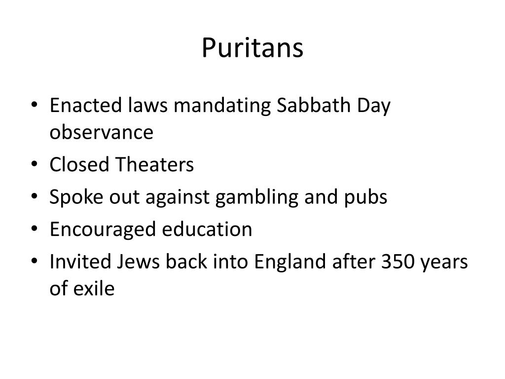 Puritans • Enacted laws mandating Sabbath Day observance • Closed Theaters • Spoke out against gambling and pubs • Encouraged education • Invited Jews back into England after 350 years of exile