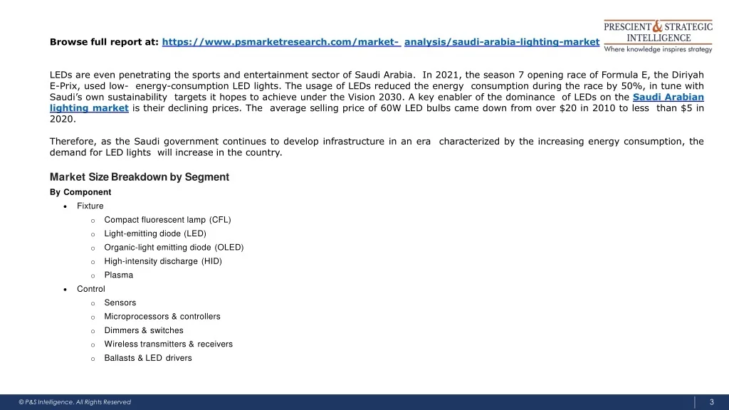 Browse full report at: https://www.psmarketresearch.com/market- analysis/saudi-arabia-lighting-market • LEDs are even penetrating the sports and entertainment sector of Saudi Arabia. In 2021, the season 7 opening race of Formula E, the DiriyahE-Prix, used low- energy-consumption LED lights. The usage of LEDs reduced the energy consumption during the race by 50%, in tune with Saudi’s own sustainability targetsithopestoachieveundertheVision2030.Akeyenablerofthedominance of LEDs on the Saudi Arabian lighting marketis their declining prices. The average selling price of 60W LED bulbs came down from over $20 in 2010 to less than $5 in 2020. • Therefore, as the Saudi government continues to develop infrastructure in an era characterized by the increasing energy consumption, the demand for LED lights will increase in thecountry. • Market Size Breakdown bySegment • ByComponent • Fixture • Compact fluorescent lamp(CFL) • Light-emitting diode(LED) • Organic-light emitting diode(OLED) • High-intensity discharge(HID) • Plasma • Control • Sensors • Microprocessors &controllers • Dimmers &switches • Wireless transmitters &receivers • Ballasts & LEDdrivers