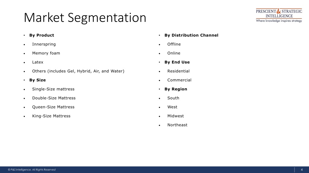 Market Segmentation • By Product • Innerspring • Memory foam • Latex • Others (includes Gel, Hybrid, Air, and Water) • By Size • Single-Size mattress • Double-Size Mattress • Queen-Size Mattress • King-Size Mattress • By Distribution Channel • Offline • Online • By End Use • Residential • Commercial • By Region • South • West • Midwest • Northeast
