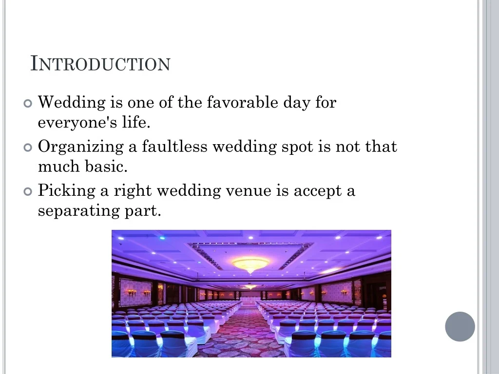 Introduction • Wedding is one of the favorable day for everyone's life. • Organizing a faultless wedding spot is not that much basic. • Picking a right wedding venue is accept a separating part.