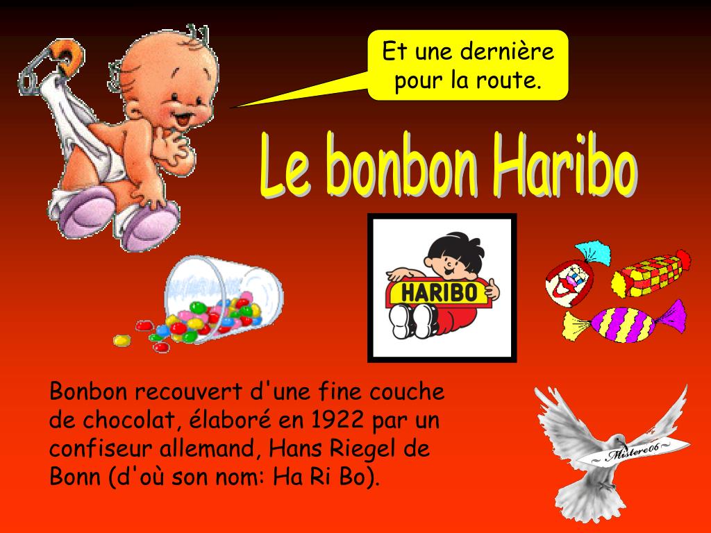 Et une dernière pour la route. Le bonbon Haribo Bonbon recouvert d'une fine couche de chocolat, élaboré en 1922 par un confiseur allemand, Hans Riegel de Bonn (d'où son nom: Ha Ri Bo).