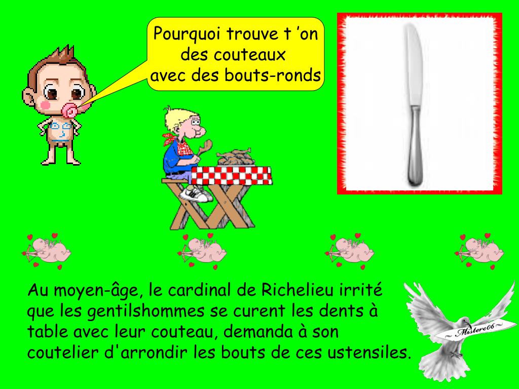 Pourquoi trouve t ’on des couteaux avec des bouts-ronds Au moyen-âge, le cardinal de Richelieu irrité que les gentilshommes se curent les dents à table avec leur couteau, demanda à son coutelier d'arrondir les bouts de ces ustensiles.