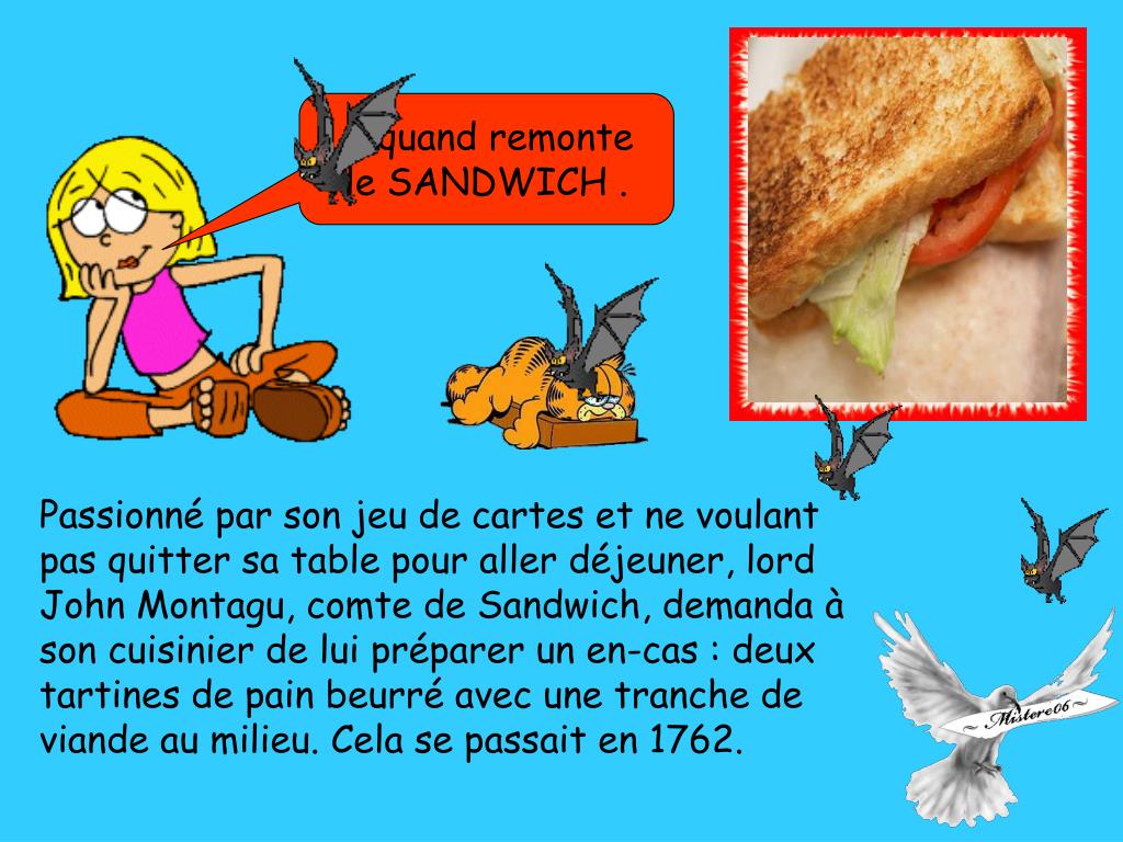 A quand remonte le SANDWICH . Passionné par son jeu de cartes et ne voulant pas quitter sa table pour aller déjeuner, lord John Montagu, comte de Sandwich, demanda à son cuisinier de lui préparer un en-cas : deux tartines de pain beurré avec une tranche de viande au milieu. Cela se passait en 1762.