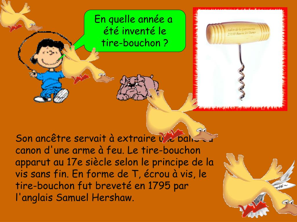 En quelle année a été inventé le tire-bouchon ? Son ancêtre servait à extraire une balle du canon d'une arme à feu. Le tire-bouchon apparut au 17e siècle selon le principe de la vis sans fin. En forme de T, écrou à vis, le tire-bouchon fut breveté en 1795 par l'anglais Samuel Hershaw.