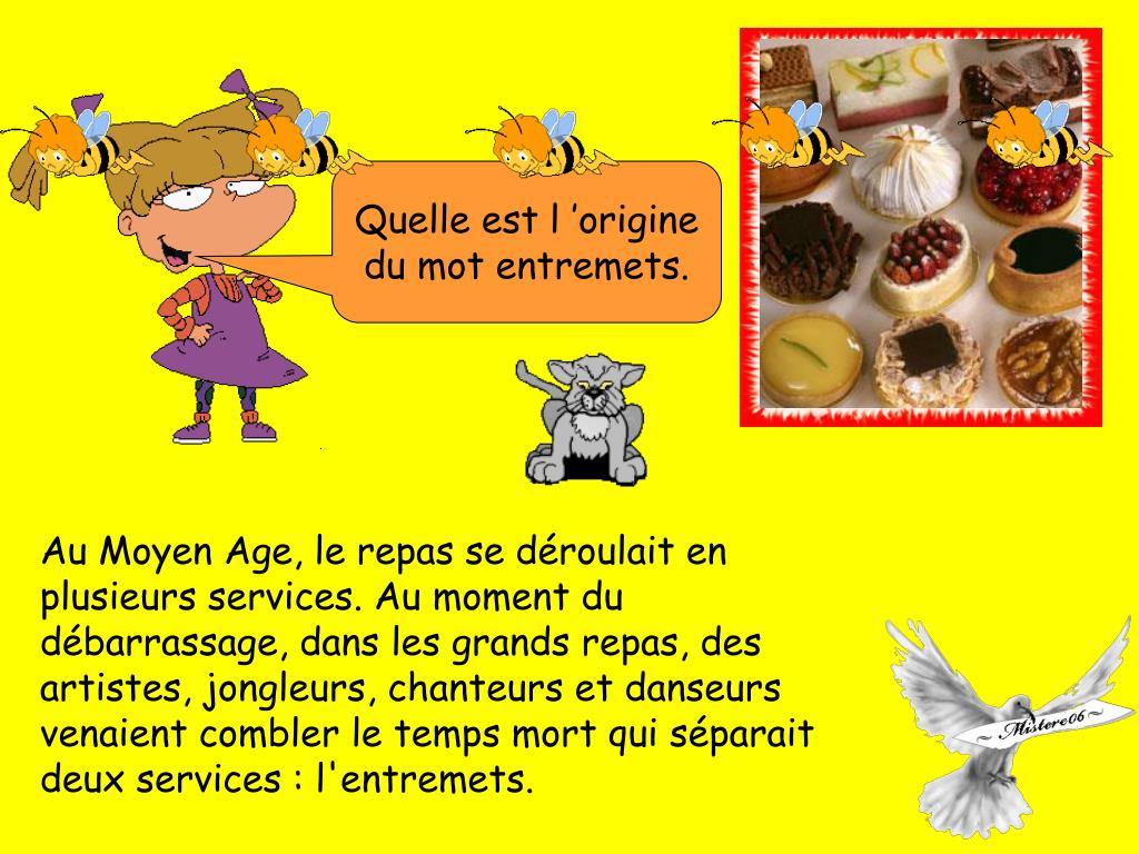 Quelle est l ’origine du mot entremets. Au Moyen Age, le repas se déroulait en plusieurs services. Au moment du débarrassage, dans les grands repas, des artistes, jongleurs, chanteurs et danseurs venaient combler le temps mort qui séparait deux services : l'entremets.