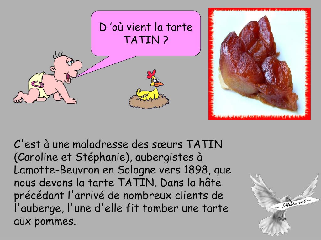 D ’où vient la tarte TATIN ? C'est à une maladresse des sœurs TATIN (Caroline et Stéphanie), aubergistes à Lamotte-Beuvron en Sologne vers 1898, que nous devons la tarte TATIN. Dans la hâte précédant l'arrivé de nombreux clients de l'auberge, l'une d'elle fit tomber une tarte aux pommes.