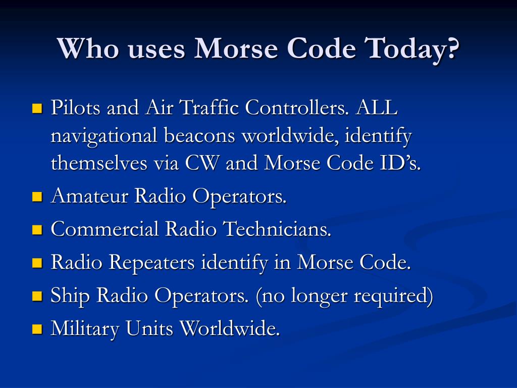 Who uses Morse Code Today? • Pilots and Air Traffic Controllers. ALL navigational beacons worldwide, identify themselves via CW and Morse Code ID’s. • Amateur Radio Operators. • Commercial Radio Technicians. • Radio Repeaters identify in Morse Code. • Ship Radio Operators. (no longer required) • Military Units Worldwide.