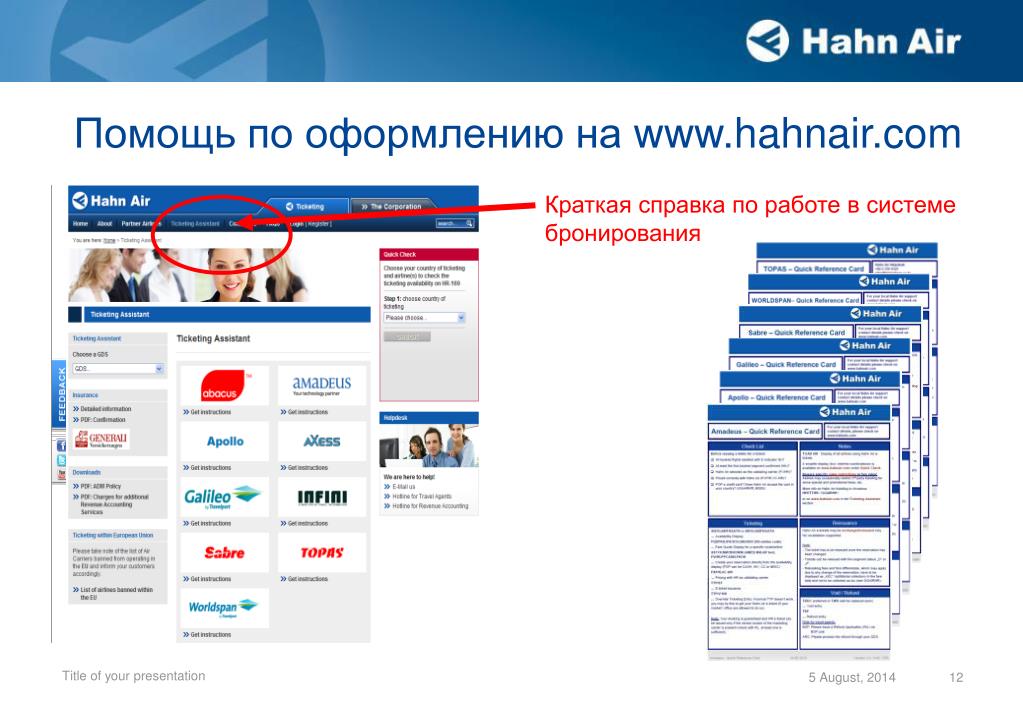 Заключение • Оформление большого числа авиакомпаний и их комбинаций через партнерство с Hahn Air • Быстрый и простой процесс оформления:один источник, один код валидации, один билет • Защита платежей для клиента • Единый контактный центр • Один источник информации:www.hahnair.com