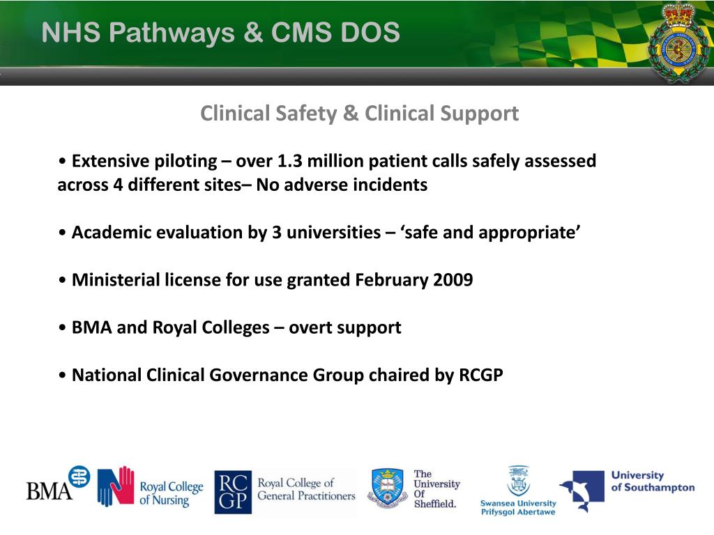 NHS Pathways & CMS DOS Clinical Safety & Clinical Support • Extensive piloting – over 1.3 million patient calls safely assessed across 4 different sites– No adverse incidents • Academic evaluation by 3 universities – ‘safe and appropriate’ • Ministerial license for use granted February 2009 • BMA and Royal Colleges – overt support • National Clinical Governance Group chaired by RCGP