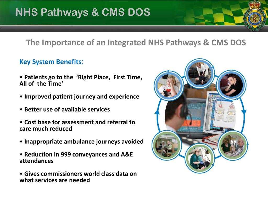 NHS Pathways & CMS DOS The Importance of an Integrated NHS Pathways & CMS DOS • Key System Benefits: • Patients go to the ‘Right Place, First Time, All of the Time’ • Improved patient journey and experience • Better use of available services • Cost base for assessment and referral to care much reduced • Inappropriate ambulance journeys avoided • Reduction in 999 conveyances and A&E attendances • Gives commissioners world class data on what services are needed