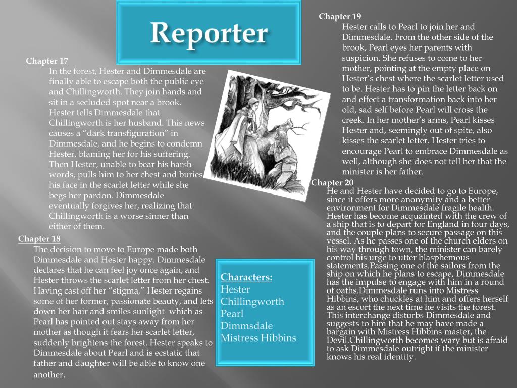 Chapter 19Hester calls to Pearl to join her and Dimmesdale. From the other side of the brook, Pearl eyes her parents with suspicion. She refuses to come to her mother, pointing at the empty place on Hester’s chest where the scarlet letter used to be. Hester has to pin the letter back on and effect a transformation back into her old, sad self before Pearl will cross the creek. In her mother’s arms, Pearl kisses Hester and, seemingly out of spite, also kisses the scarlet letter. Hester tries to encourage Pearl to embrace Dimmesdale as well, although she does not tell her that the minister is her father. Reporter Chapter 17In the forest, Hester and Dimmesdale are finally able to escape both the public eye and Chillingworth. They join hands and sit in a secluded spot near a brook. Hester tells Dimmesdale that Chillingworth is her husband. This news causes a “dark transfiguration” in Dimmesdale, and he begins to condemn Hester, blaming her for his suffering. Then Hester, unable to bear his harsh words, pulls him to her chest and buries his face in the scarlet letter while she begs her pardon. Dimmesdale eventually forgives her, realizing that Chillingworth is a worse sinner than either of them. • Chapter 20He and Hester have decided to go to Europe, since it offers more anonymity and a better environment for Dimmesdale fragile health. Hester has become acquainted with the crew of a ship that is to depart for England in four days, and the couple plans to secure passage on this vessel. As he passes one of the church elders on his way through town, the minister can barely control his urge to utter blasphemous statements.Passing one of the sailors from the ship on which he plans to escape, Dimmesdale has the impulse to engage with him in a round of oaths.Dimmesdale runs into Mistress Hibbins, who chuckles at him and offers herself as an escort the next time he visits the forest. This interchange disturbs Dimmesdale and suggests to him that he may have made a bargain with Mistress Hibbins master, the Devil.Chillingworth becomes wary but is afraid to ask Dimmesdale outright if the minister knows his real identity. • Chapter 18The decision to move to Europe made both Dimmesdale and Hester happy. Dimmesdale declares that he can feel joy once again, and Hester throws the scarlet letter from her chest. Having cast off her “stigma,” Hester regains some of her former, passionate beauty, and lets down her hair and smiles sunlight which as Pearl has pointed out stays away from her mother as though it fears her scarlet letter, suddenly brightens the forest. Hester speaks to Dimmesdale about Pearl and is ecstatic that father and daughter will be able to know one another. • Characters: • Hester • Chillingworth • Pearl • Dimmsdale • Mistress Hibbins