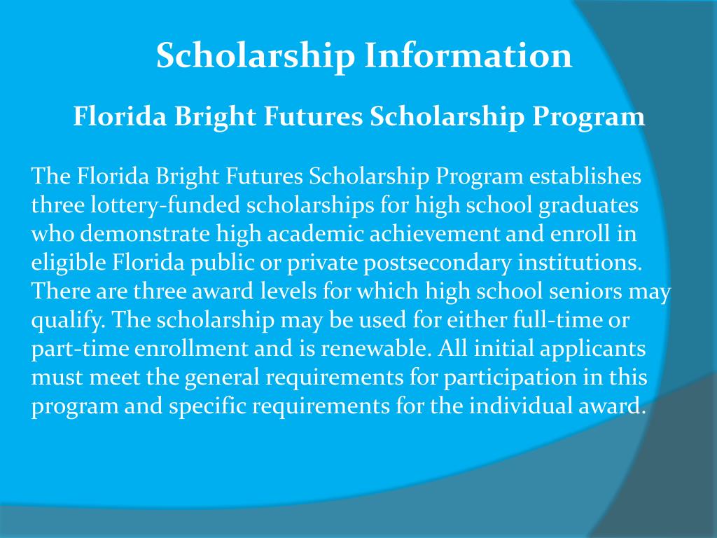 Scholarship Information Florida Bright Futures Scholarship Program The Florida Bright Futures Scholarship Program establishes three lottery-funded scholarships for high school graduates who demonstrate high academic achievement and enroll in eligible Florida public or private postsecondary institutions. There are three award levels for which high school seniors may qualify. The scholarship may be used for either full-time or part-time enrollment and is renewable. All initial applicants must meet the general requirements for participation in this program and specific requirements for the individual award.